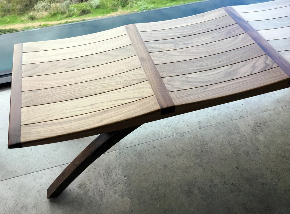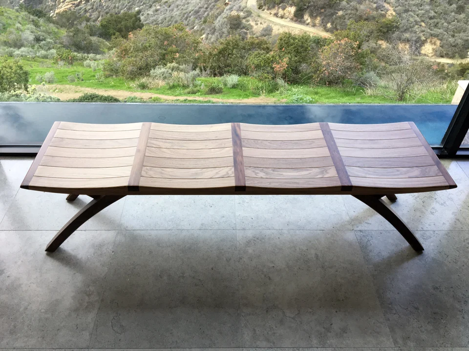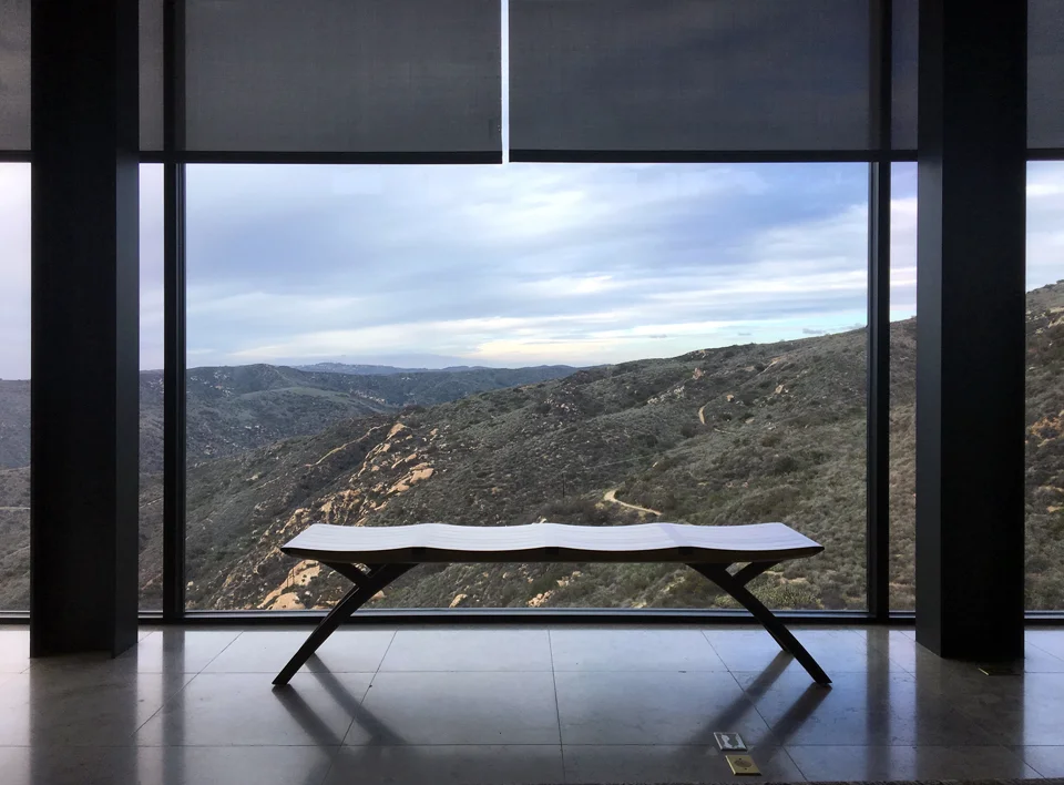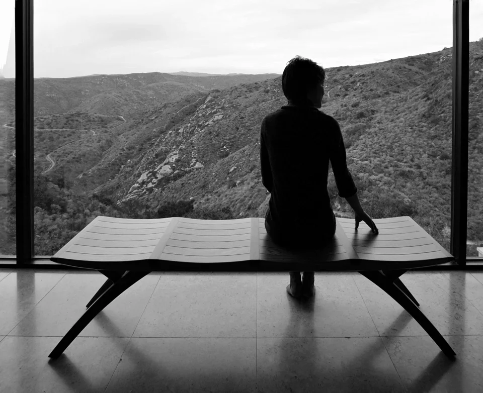 The Brazilian handcrafted bench complements the minimalist architectural palette of concrete, stone and and steel, with a gentle curvilinear profile that evokes the undulations of the surrounding coastal canyons and Pacific Ocean beyond.
