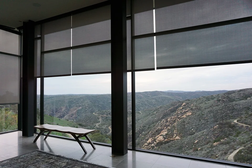 Full height glazing and exposed structure not only frame the beautiful views, but also serve as a lovely backdrop for the warm modern lines of the design, allowing for ample natural light that highlights the subtle movement of the louro freijo wood grain.
